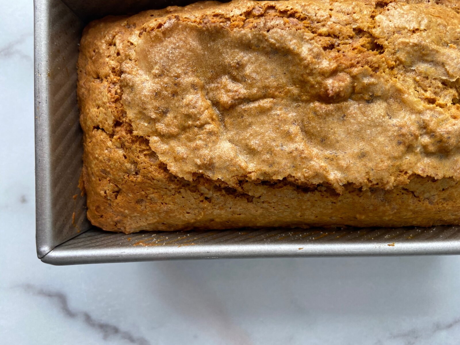 Unsure which is better, the butterscotch or the sugar crusted top! I use a food processor to rough chop the butterscotch chips versus doing this by hand. This way there aren’t hunks and the bits of butterscotch can melt with the bread. Before you add your bread loaves into the oven, see below the sugar sprinkled on the prepared pans. You can do this to any bread or muffin to give some texture and a little something extra to your bread. This Soft Pumpkin Butterscotch Gluten free Bread will become a staple during your holidays!