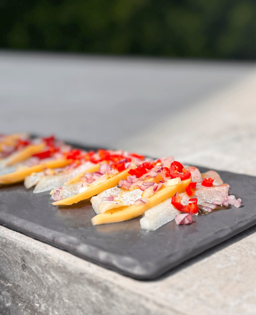 Yellowtail Sashimi Platter with Mango and Chili on a slate serving platter